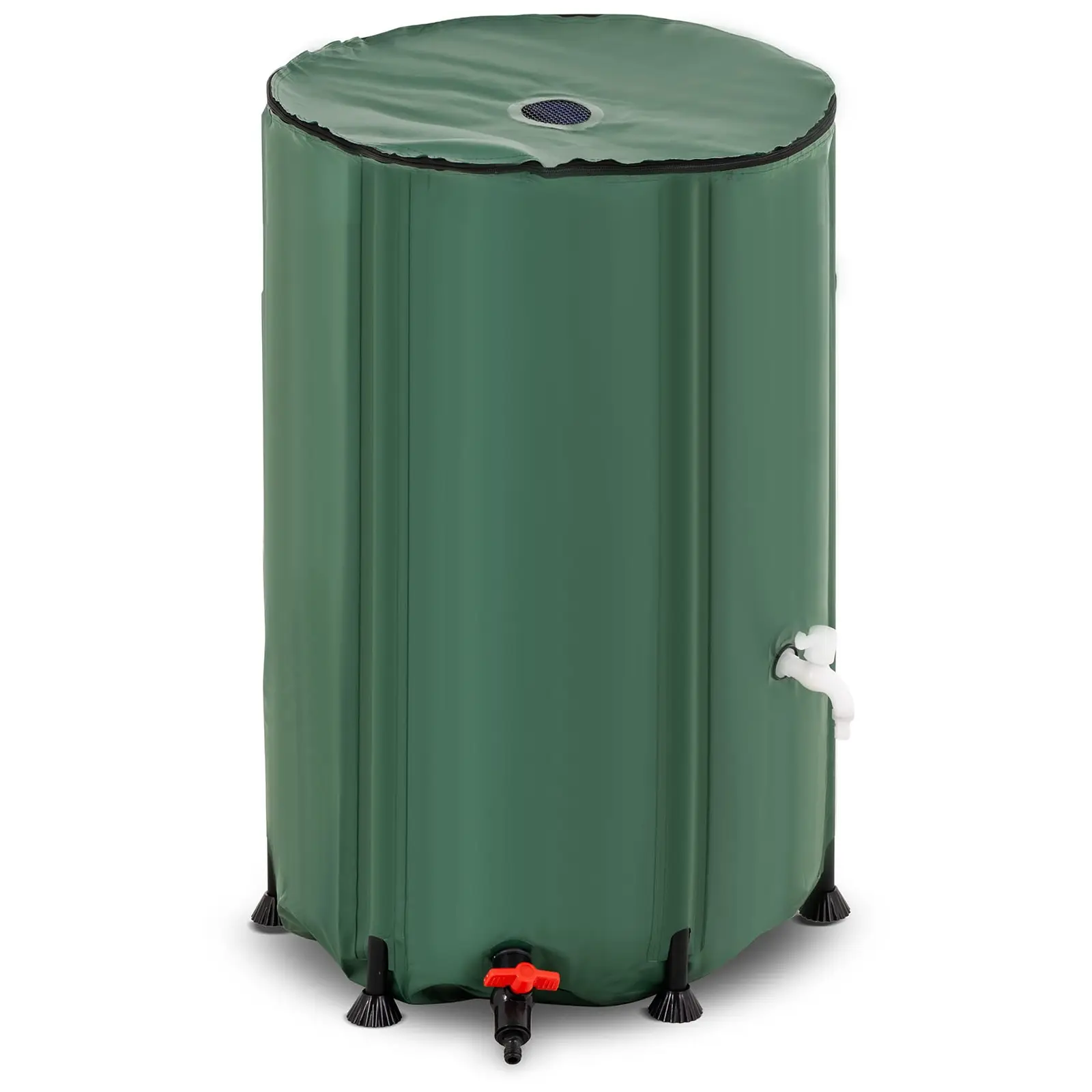 Die Regenwassertonne ist im Handumdrehen aufgebaut. Die Hülle aus reißfestem PVC spannen Sie mithilfe der Kunststoffstangen, die der Tonne Stabilität verleihen. Für optimale Standfestigkeit befestigen Sie die Standfüße unter den Stangen. Die Abdeckung ist mit einem Loch versehen, über das Sie das Regenwasser ins Innere leiten. Dreck oder Blätter kommen dank eines Netzfilters nicht in die Tonne.