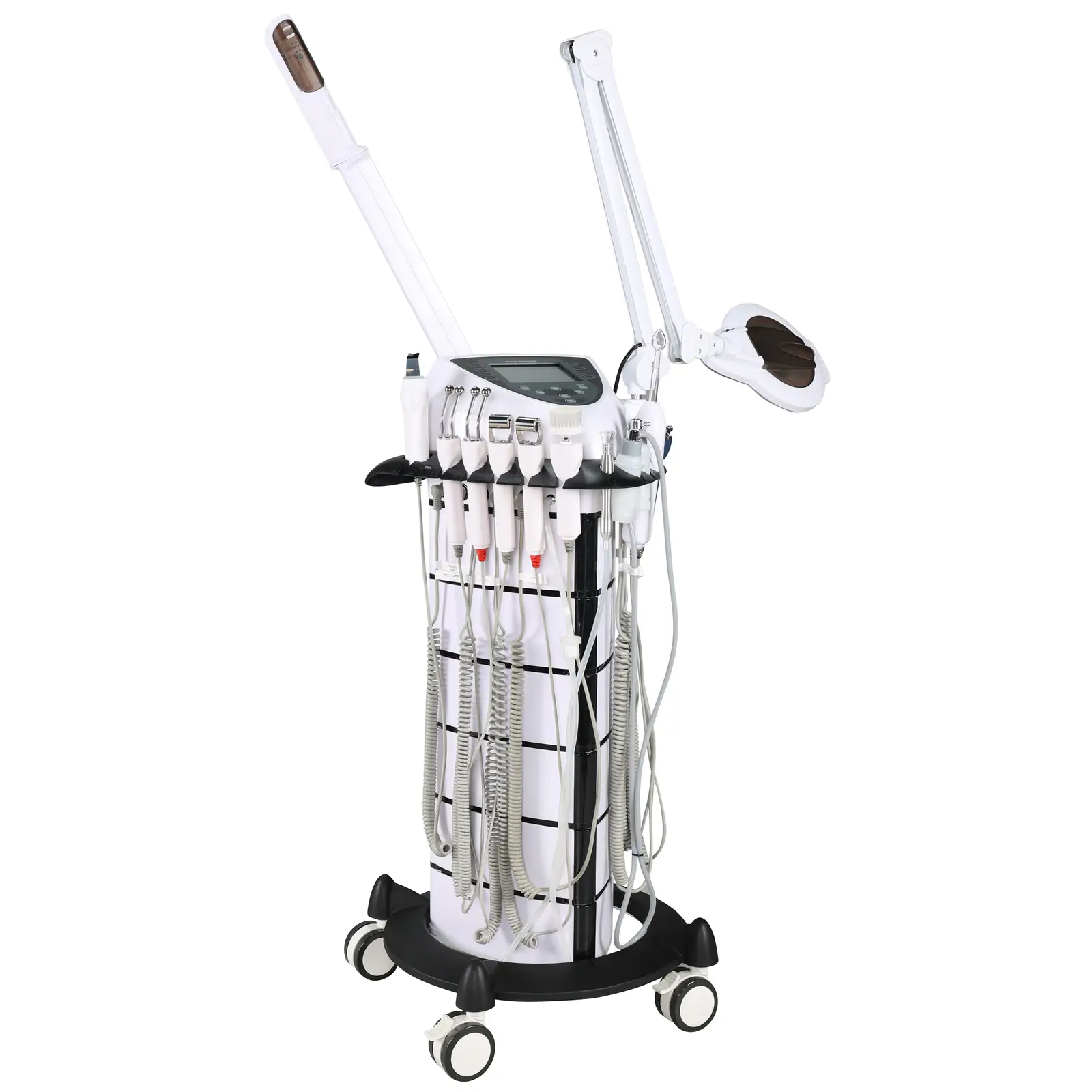 Erweitern Sie Ihr Angebot mit dem kompakten Kosmetikturm von physa! Mit acht Funktionen, der integrierte Lupenleuchte und Stauraum für Kosmetika führen Sie alle gefragten Schönheitsbehandlungen durch, ohne dafür viel Geld für einzelne Spezialgeräte auszugeben. Gleichzeitig benötigt der Multifunktionsturm selbst nur wenig Platz und eignet sich damit ideal für kleine Studios. Auf vier Rollen mit umlaufender Fußlaufstütze sowie zwei Griffen nutzen Sie dieses Modell komfortabel in verschiedenen Räumen und mit der perfekten Positionierung für die unterschiedlichen Behandlungen.