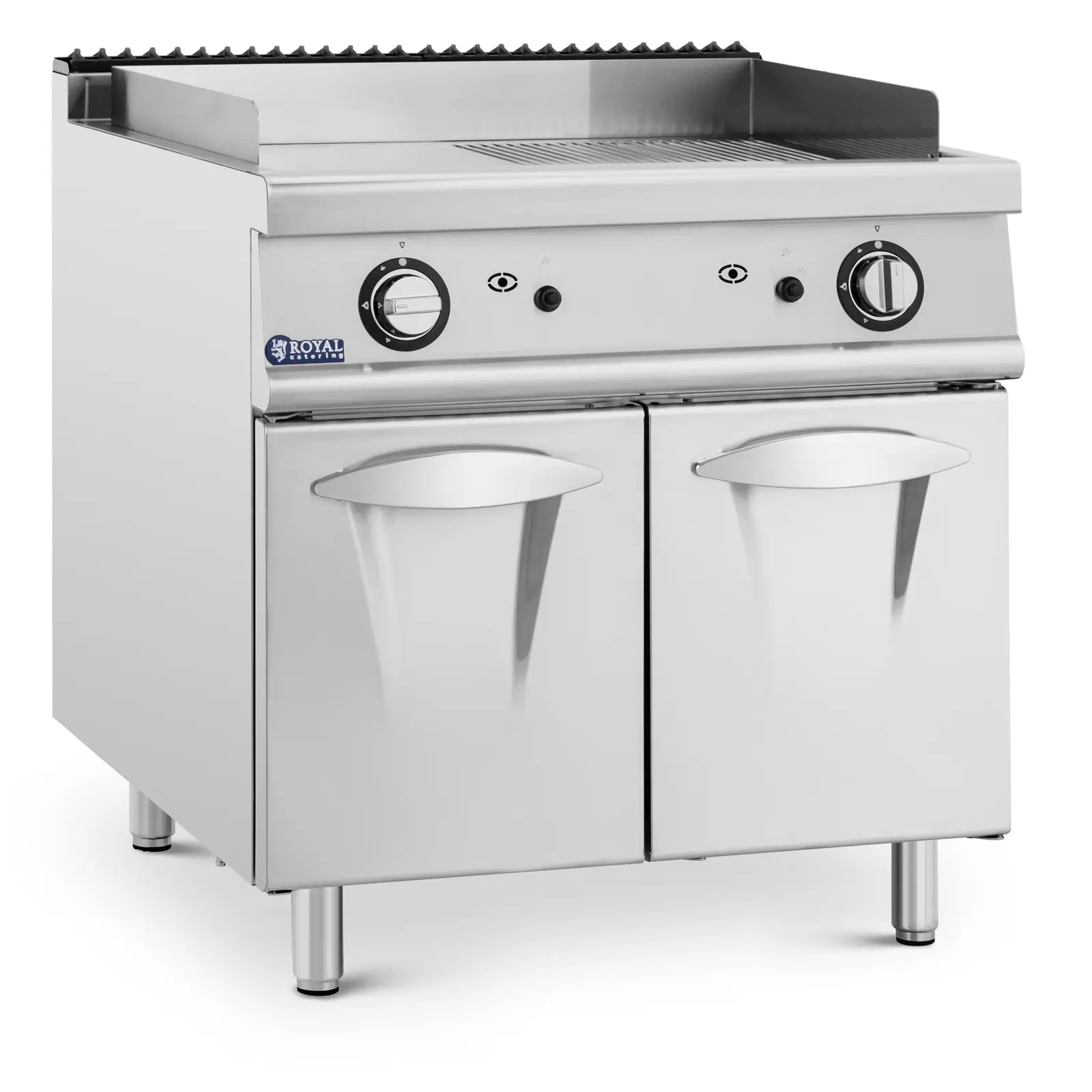 Auf der Gas-Grillplatte von Royal Catering garen Sie Würstchen, Speck, Burger, Gemüse und Toasts wie im Schlaf! Das robuste Modell mit einer Grillplatte aus Chromstahl ist ideal für die Gastronomie geeignet, ob für Hotels, Cafeterias, Imbisswagen, Bistros, Bars, Restaurants oder Catering-Veranstaltungen. Unterhalb der teils glatten, teils geriffelten Grillfläche finden Sie einen geräumigen Schrank für Töpfe, Pfannen und andere Küchenutensilien, die Sie stets staubgeschützt aufbewahren. Über zwei Schwenktüren öffnen Sie diesen und haben schnell Zugriff auf Ihre Arbeitsmaterialien.
