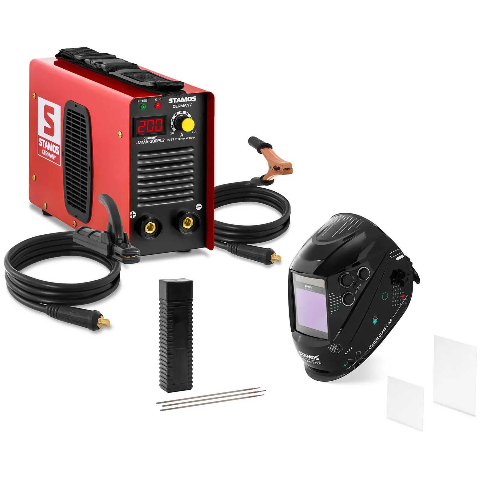 Das Elektroden-Schweißgerät S-MMA-200PI.2 von Stamos Germany mit IGBT Inverter-Technologie verbindet Leistungsstärke mit kompakter, bequem tragbarer Bauweise. Diese Eigenschaften nutzen Sie nicht nur zum Schweißen in der Werkstatt oder der Fabrikhalle, sondern auch für Reparatur- und Wartungsarbeiten im Außenbereich. Den Schweißstrom stellen Sie stufenlos per Regler bis 200 A ein und überprüfen auf dem großen LED-Display die entsprechenden Parameter. Für Ihre Sicherheit sorgt der Schweißhelm Colour Glass Y-100, der aus der unverwüstlichen Materialmischung TECAMID 66 besteht. Dank des farbigen Sichtfelds sehen Sie alle Details noch präziser. Ob beim Schiffsbau, für Druckbehälter oder Brücken, mit den Stabelektroden schweißen Sie zuverlässig hochfeste Stahlkonstruktionen, die statischen wie dynamischen Belastungen ausgesetzt sind. Die basischen Elektroden haben die Maße 2,5 x 350 mm und kommen in der Verpackungsgröße von 5 kg.